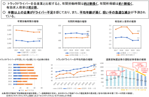 これらのグラフから、日本の物流を支えるトラックドライバーを取り巻く状況が、総数という量的側面だけではなく、質的な課題(高齢化、労働環境、若者離れ)を抱えていることがご理解いただけたかと思います。