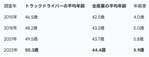 - 顕著な高齢化: トラックドライバーの平均年齢は、2023年時点で50.3歳となっており、全産業の平均年齢(44.4歳)を大きく上回っています。この10年間で両者の差は拡大傾向にあります。
